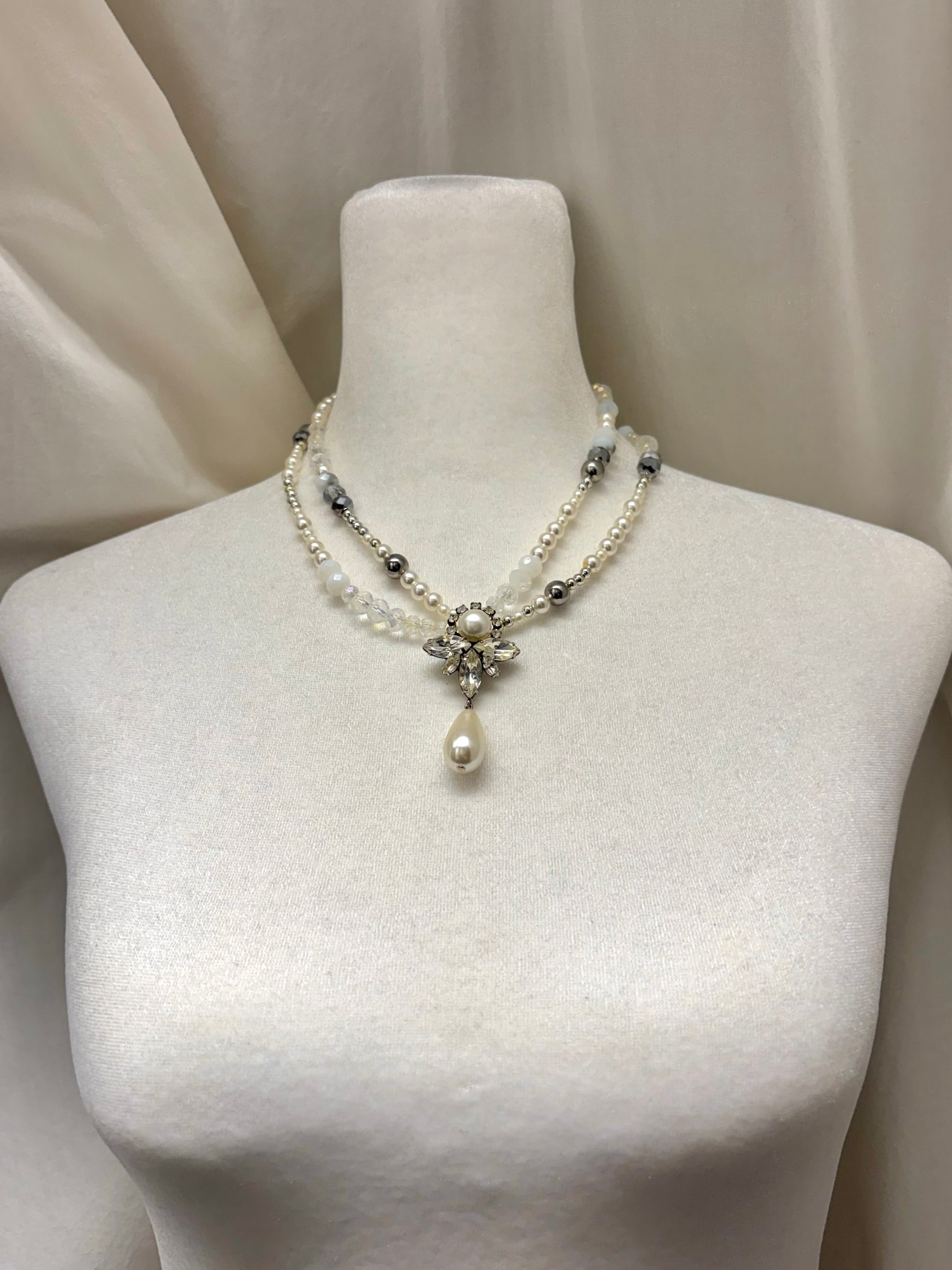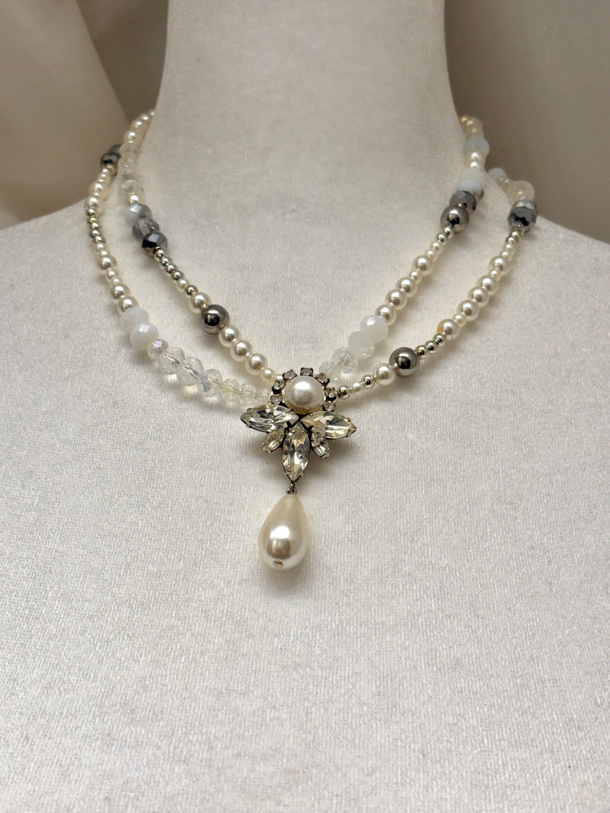 Silver Mixed Material, Vintage Crystal and Pearl Pendant, Glass Beads on Elastic String Necklace